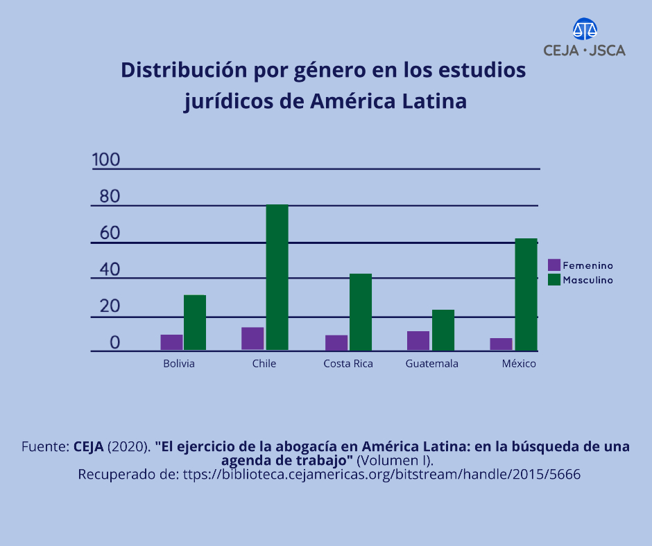 De acuerdo a la información obtenida, la presencia de abogadas socias en los estudios jurídicos de prestigio es minoritaria, pese a que la incorporación de las mujeres en el ámbito del Derecho es un proceso iniciado desde el siglo XIX en la región, que para el año 2010 estimaba que la presencia de abogadas en la oferta de profesionales era de 35% en México, 58% en Chile, 44% en Guatemala, 48% en Bolivia y 45% en Costa Rica.