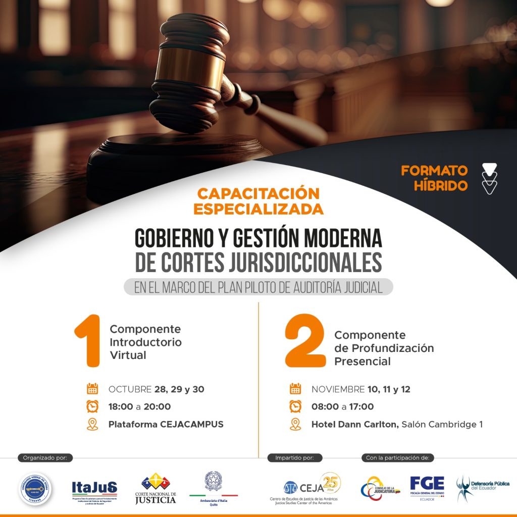 El Centro de Estudios de Justicia de las Américas (CEJA) dará inicio este 28 de octubre en Ecuador al Programa Especializado “Gobierno y Gestión Moderna de Altas Cortes Jurisdiccionales”, desarrollado en alianza con la Corte Nacional de Justicia y la Organización Internacional Italo-Latinoamericana (IILA), en el marco del proyecto FIEDS/ITAJUS.
