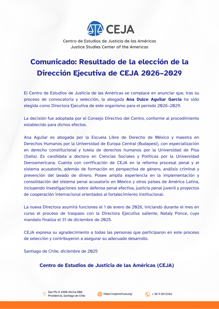 El Centro de Estudios de Justicia de las Américas (CEJA) se complace en anunciar que, tras su proceso de convocatoria y selección, la abogada Ana Dulce Aguilar García ha sido elegida como Directora Ejecutiva de este organismo para el periodo 2026–2029.